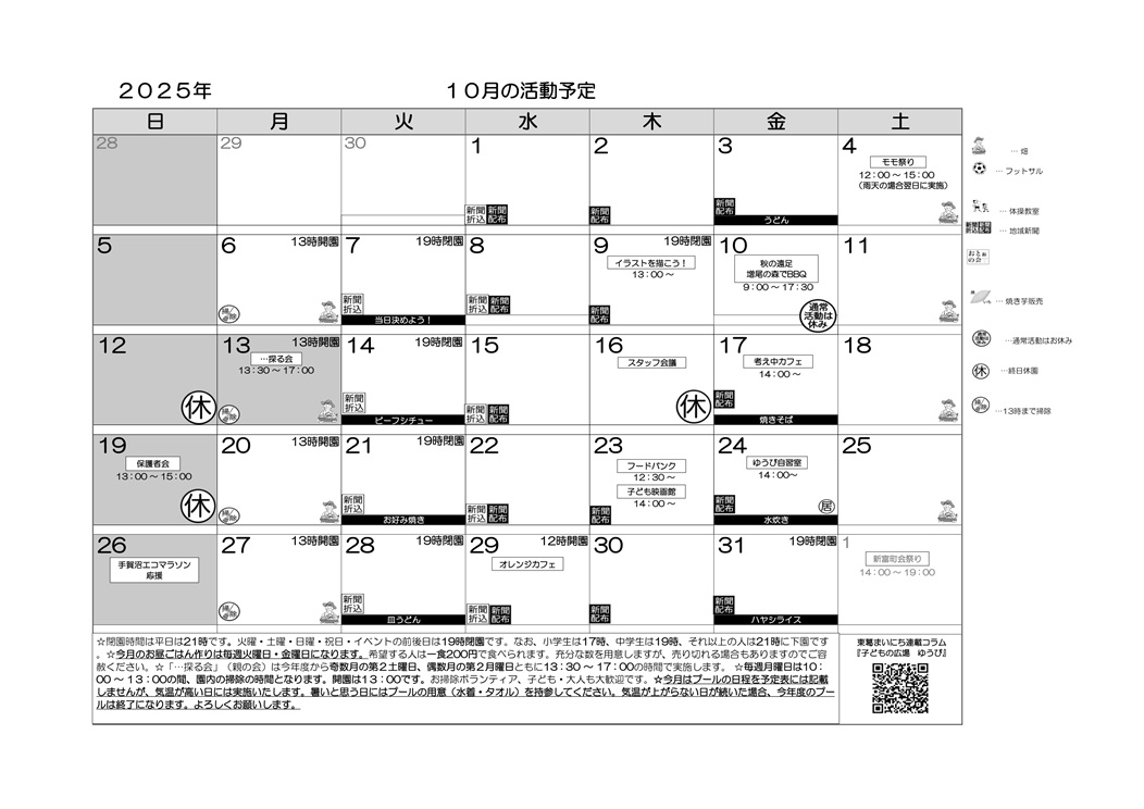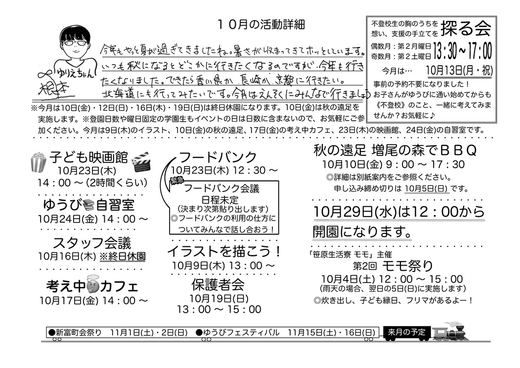 5月 | まちづくり宿泊(宿泊活動)、NPO総会、保護者会、ゆうび便り発行 |